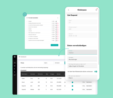 Hotels haben zudem die Möglichkeit, beliebig viele Altersgruppen zu definieren und altersabhängige Fragen individuell anzupassen – etwa zu Allergien, Interessen, Besonderheiten oder Abholberechtigungen. Alle erfassten Daten können anschließend gefiltert, durchsucht und exportiert werden, was die Planung zusätzlich erleichtert.